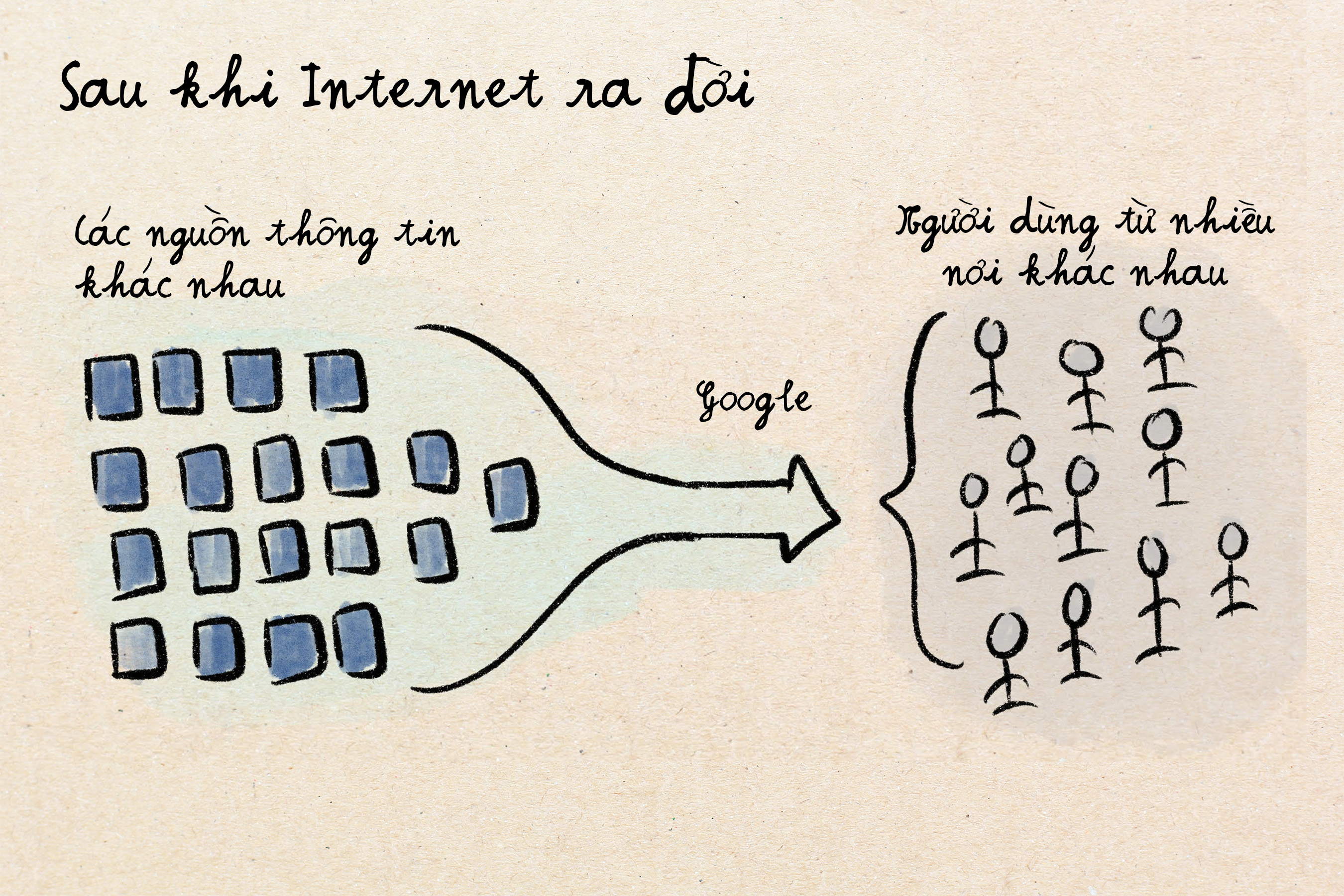 Mạng Internet đã thay đổi điều này hoàn toàn. Trong một thời gian ngắn, việc tiếp cận khách hàng toàn cầu trở nên miễn phí qua mạng. Nhưng lấy được sự chú ý của khách hàng khi có quá nhiều thông tin ập vào họ, lại trở nên khó khăn hơn. Những công ty thắng cuộc là ai có thể tập hợp người dùng với nhu cầu mua sản phẩm và các nhà cung cấp nội dung/sản phẩm tại một nơi. Như là chợ tập trung người mua và bán, nhưng cho thông tin và sản phẩm toàn cầu. Google tìm kiếm trở thành tâm điểm đó.