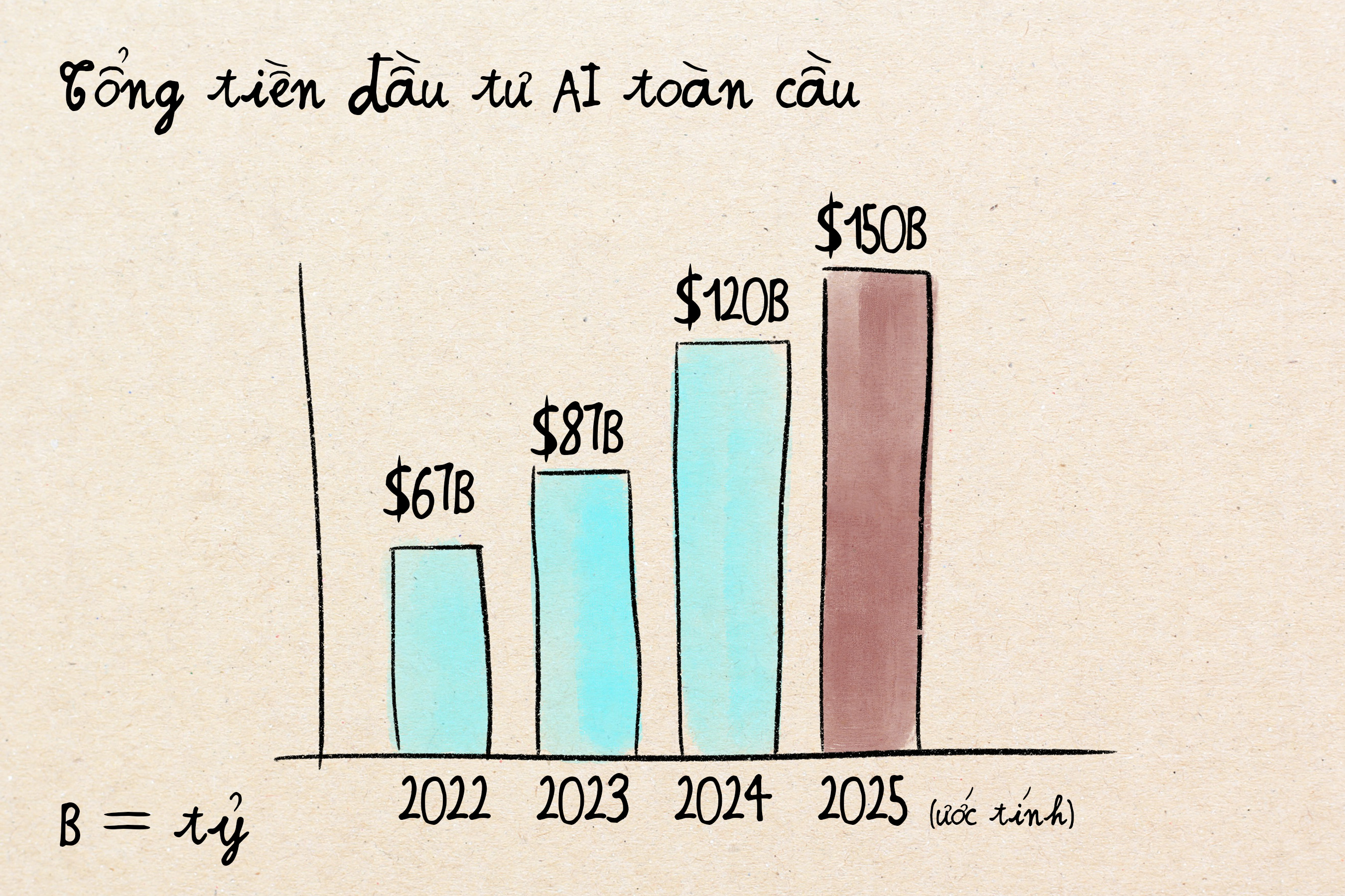 Khoảnh khắc ChatGPT được tung ra thị trường đã kích hoạt một làn sóng đầu tư vào AI trên toàn cầu. Tất cả các quỹ đầu tư (VC – venture capital trong tiếng Anh) đồng loạt muốn ném tiền vào AI mà không cần hỏi nhiều, vì họ sợ mất đi cơ hội đón đầu làn sóng đang đi lên. Con số đầu tư vào AI chỉ trong vài năm qua nghe thì như phim viễn tưởng: