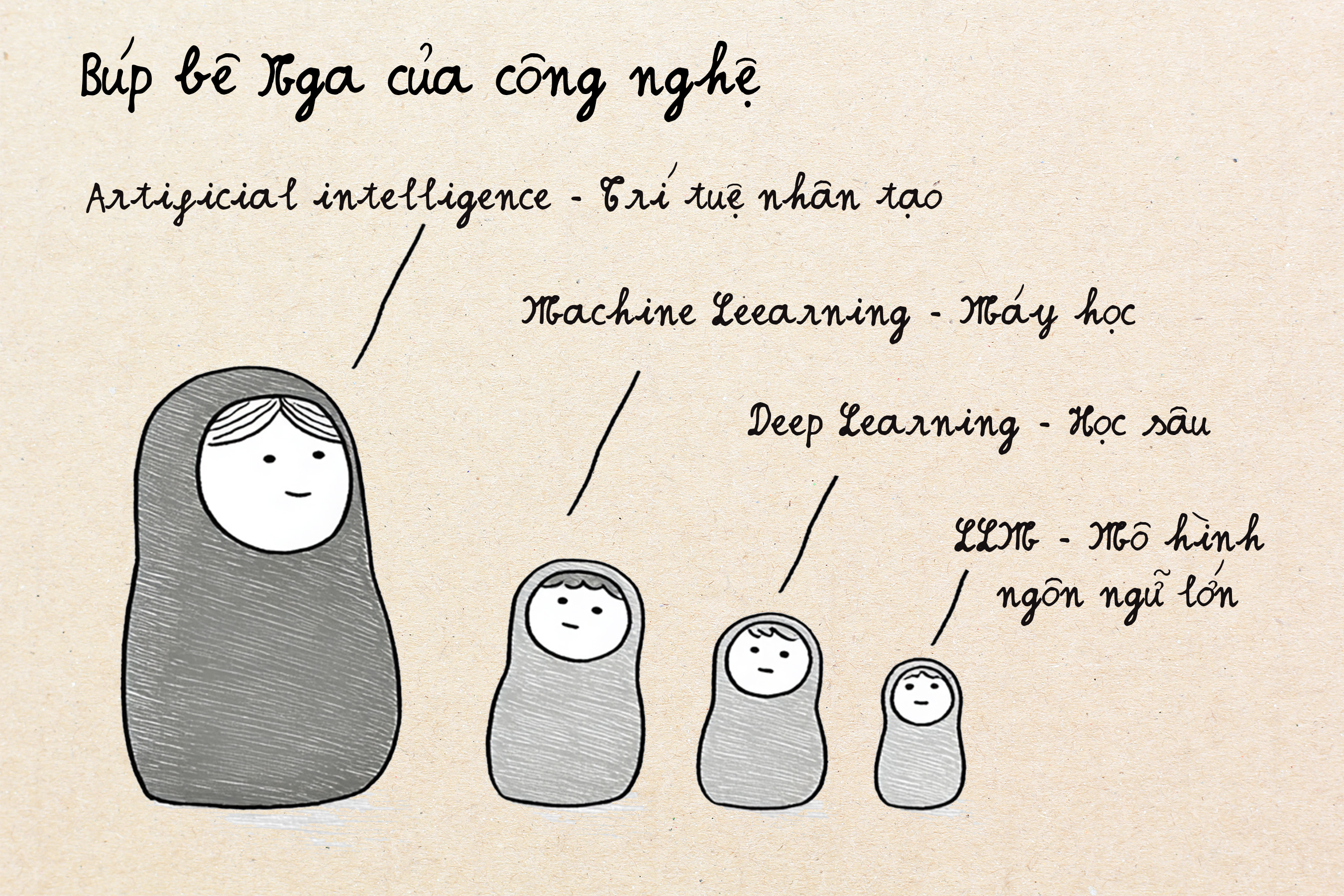 "AI" là một thuật ngữ mà mọi người sử dụng nhưng không ai thực sự định nghĩa được cho chuẩn. Để dễ hiểu, ta lấy con búp bê Nga để giải thích nhé. Có nhiều loại công nghệ AI và mối quan hệ của chúng giống như những con búp bê Nga, với mỗi tầng búp bê đại điện cho một mức độ công nghệ khác nhau.