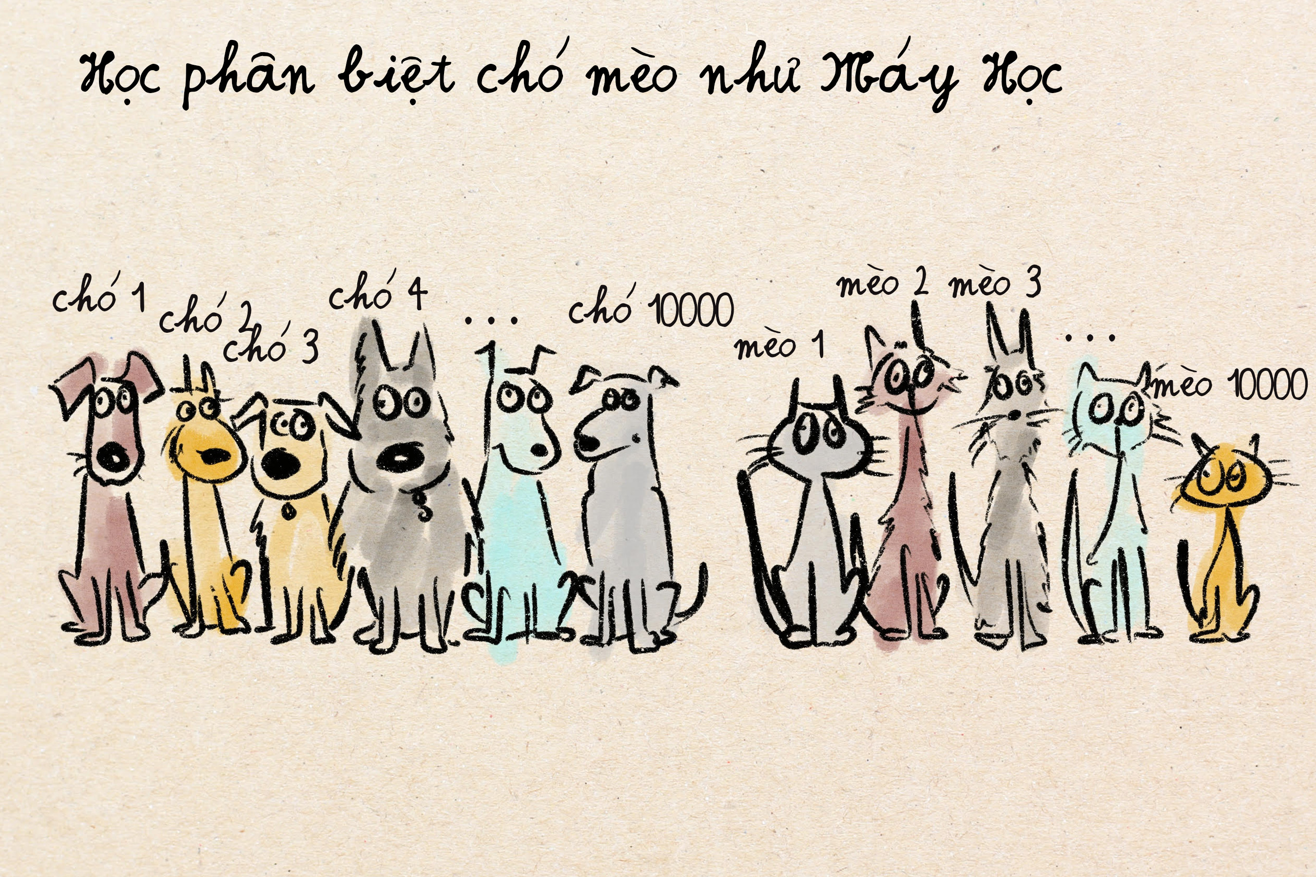 Nhưng nếu áp dụng cách dạy như trong Machine Learning thì thay vì quy tắc, ta sẽ cho trẻ xem 10.000 hình ảnh được gắn nhãn "chó" và 10.000 hình ảnh được gắn nhãn "mèo". Và để cho não của trẻ tự nhận ra những điểm chung đặc trưng của chó và mèo. Cách dạy này thường dẫn tới kết quả tốt hơn, ngay cả cho những nhiệm vụ khó có thể chắt lọc thành quy tắc cứng.