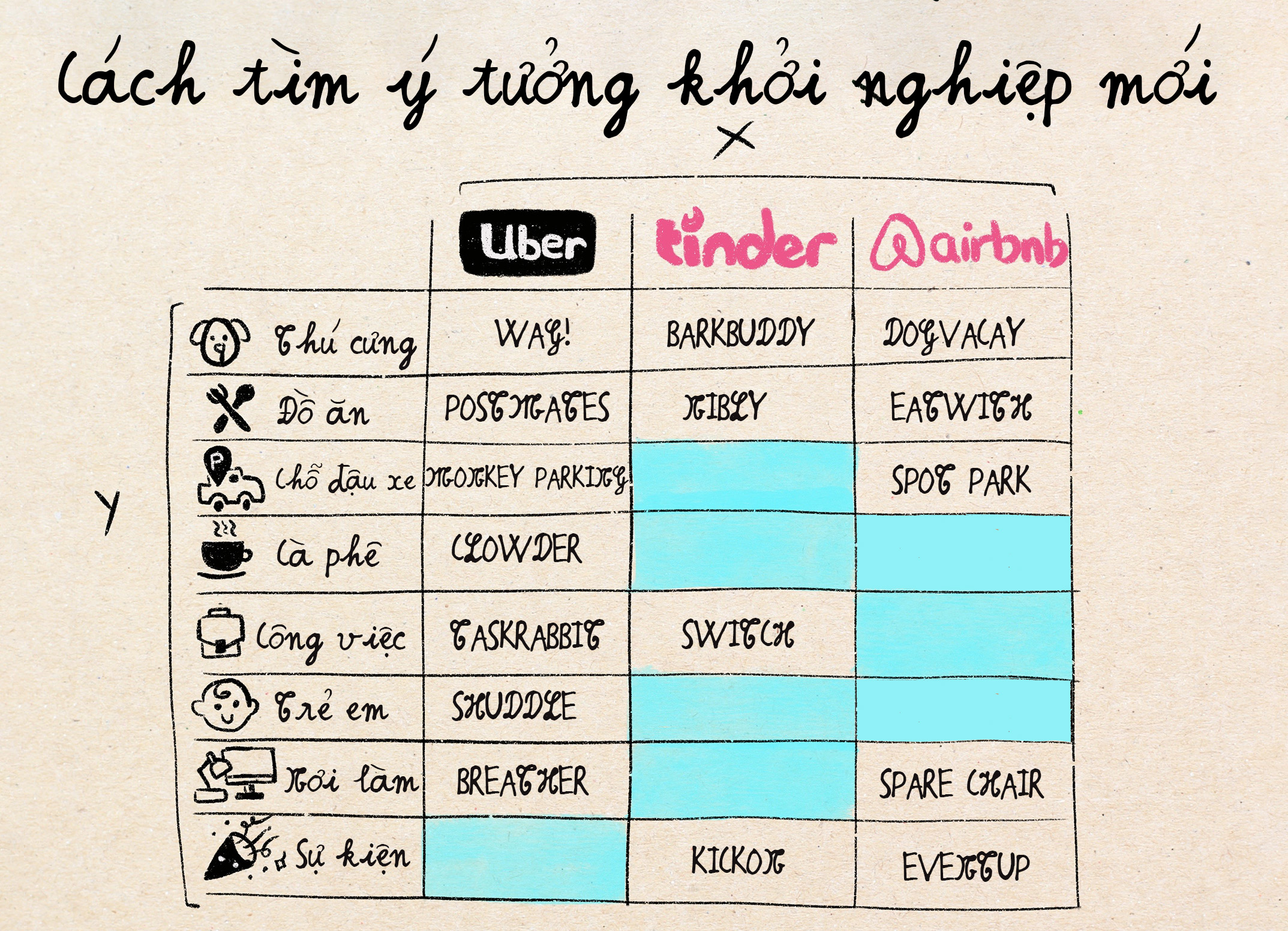 Nhưng có hai cách khác khá thú vị để sử dụng cụm từ này: Thứ nhất là dùng nó để giúp bạn động não "ý tưởng" mới cho sản phẩm mới. Cách làm như sau: vẽ ra một biểu đồ như bên dưới với X là các công ty với mô hình kinh doanh hay và thành công (như Uber, Tinder, Birchbox, Airbnb, v.v.) và chiều Y là các đối tượng người dùng bạn muốn tập trung vào thiết kế sản phẩm cho (như chó mèo, thức ăn, thế hệ genZ, v.v.), hoặc điểm đặc biệt nào đó khiến bạn khác với công ty X. Sau đó dùng Google để tìm ra xem đã có công ty nào làm sản phẩm phục vụ đối tượng tập trung Y với mô hình kinh doanh X chưa. Sau khi điền hết cái bảng này với tên những công ty đã có trên thị trường, bạn sẽ nhanh chóng nhận ra thị trường có lỗ hổng gì chưa có tay chơi để bạn có thể đào sâu hơn.