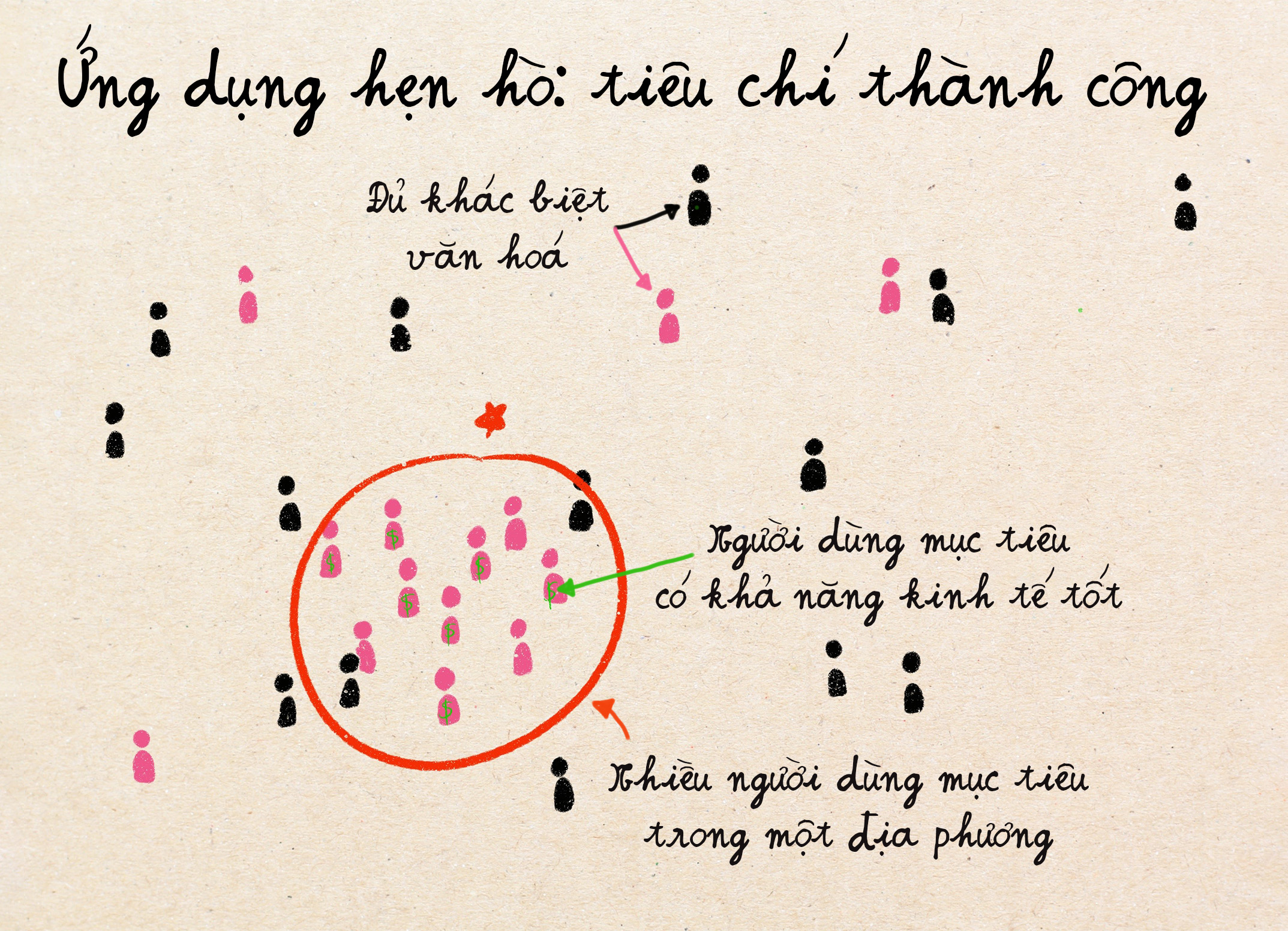 Như cấp độ 2, thành công của các công ty này sẽ phụ thuộc vào việc nhóm đối tượng có đủ lớn và đủ khác biệt với đối tượng đại trà hay không. Ví dụ như nhóm những người ăn chay, có bao nhiêu người, và thực ra họ có quan tâm tới tìm người cũng ăn chay giống mình không, hay cuộc sống yêu đương của họ có thật sự bị ảnh hưởng nếu họ kết nối với người không ăn chay không? Nếu như nhóm người này ít hoặc không quan tâm lắm tới việc yêu đương người khác mình về lối sống ăn chay, thì sản phẩm phục vụ nhu cầu này sẽ không có chỗ đứng.