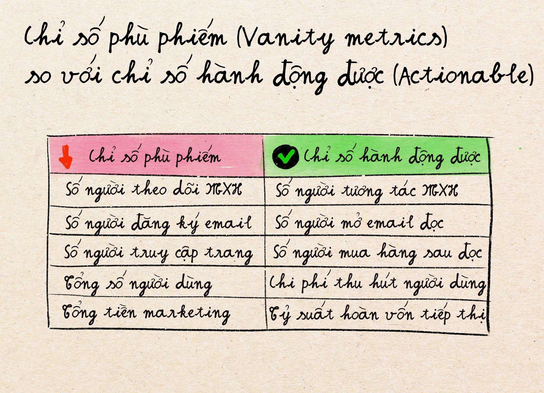 Tối ưu hoá những chỉ số này cho ứng dụng hẹn hò cũng giống như tối ưu hóa bệnh viện bằng cách giữ bệnh nhân ốm lâu hơn (nhiều người dùng hơn, tỷ lệ giữ chân người dùng cao hơn). Ta gọi những chỉ số này là "Vanity Matrics", tạm dịch là các chỉ số phù phiếm không phản ánh giá trị thực sự của một sản phẩm. Để phát triển chiến lược đúng đắn, ta cần đo lường những gì thực sự tạo ra giá trị dài hạn. Với các ứng dụng hẹn hò, một số các chỉ số có ý nghĩa hơn bao gồm: